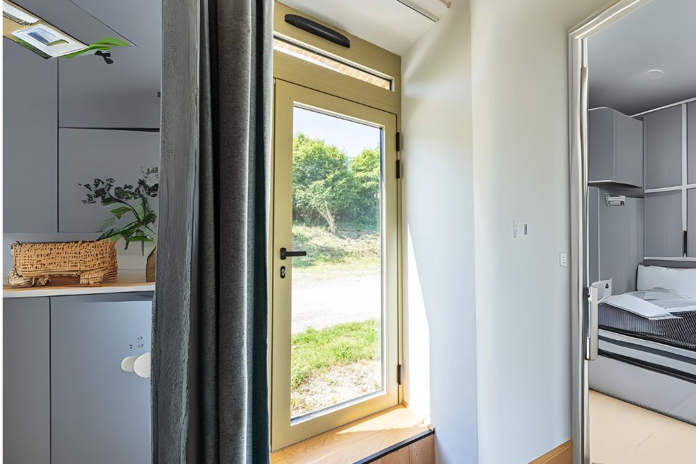 - Esthétique discrète : le vantail disparaît, seule la partie vitrée est visible depuis l’extérieur.