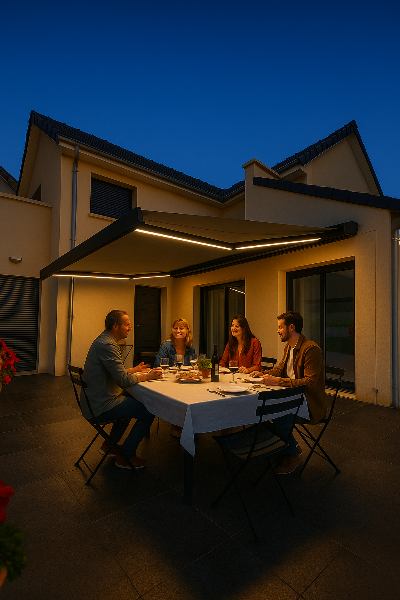 Ce projet transforme l’espace extérieur en véritable lieu de vie, protégé du soleil et fonctionnel même le soir grâce à l’éclairage intégré.