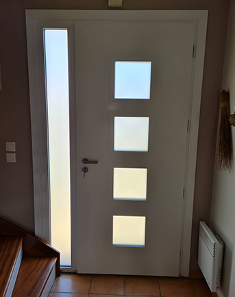 Porte sans cadre de vitrage, vitrage sablé non sérigraphié, 4 oculus carrés soulignés de rainurages, poignée rosace finition inox Bel’M, barillet standard.