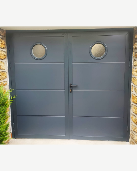 Porte de garage 2 battants avec fenêtre en hublot pour un style contemporain.