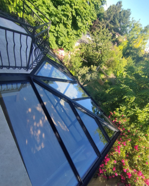 Nous avons remplacé une véranda bois avec terrasse sur la toiture par une véranda en aluminium au style graphique et moderne en conservant la spécificité de la terrasse.